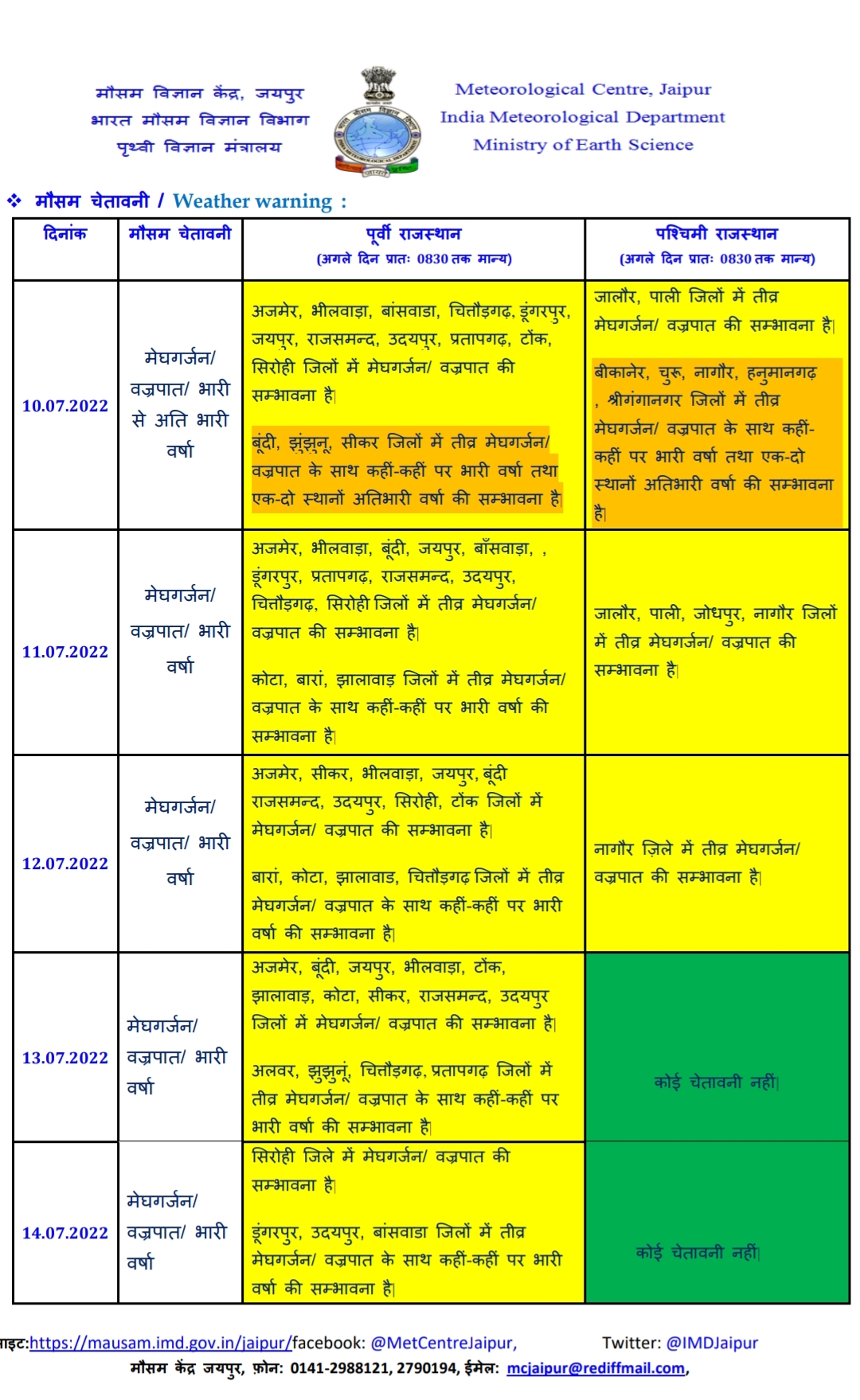 वहीं, 11 जुलाई को अजमेर, अलवर, बारां, भरतपुर, भीलवाड़ा, बूंदी, दौसा, धौलपुर, जयपुर, करौली, सवाई माधोपुर, सीकर और टोंक जिलों में बारिश साथ बिजली चमकने और गिरने की संभावना है। साथ ही बांसवाड़ा, डूंगरपुर, सिरोही, कोटा, झुंझुनूं, झालावाड़, चित्तौड़गढ़, प्रतापगढ़, राजसमंद, उदयपुर, चूरू, जालोर, पाली, हनुमानगढ़, श्रीगंगानगर और नागौर में भारी बारिश हो सकती है।