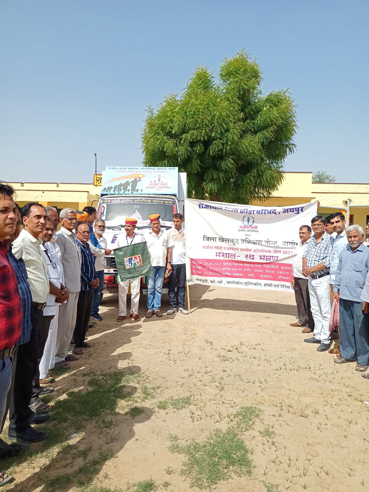 लाडनूं। राजीव गांधी ग्रामीण ओलंपिक खेलकूद प्रतियोगिता से पूर्व खेलकूद की भावना जागृत करने के प्रचार प्रसार के लिए मशाल यात्रा पंचायत समिति लाडनूँ से प्रारम्भ की गई। राजकीय उच्च माध्यमिक विद्यालय मंगलपुरा में पहुंचने स्वागत किया गया। कार्यक्रम की अध्यक्षता विधायक प्रतिनिधि सुरजाराम भाकर, मशाल यात्रा प्रभारी जिला खेल अधिकारी भंवराराम सियाक, एथेलेटिक्स कोच रोल बॉल कोच सुरेश डारा, शूटिंग बॉल कोच श्याम घिंटाला, पीईईओ जयपाल शर्मा, सरपंच चम्पालाल मेघवाल, उपसरपंच तोलाराम द्वारा भव्य स्वागत किया गया। गुलाबचंद सांखला ने बताया कि 29 मई को मशाल यात्रा जयपुर से रवाना हुई, जो विभिन्न जिलों में होती हुई नागौर जिले दो दिनों तक रही। लाडनूँ उपखण्ड क्षेत्र में ग्राम पंचायत मुख्यालय के राजकीय उमावि मंगलपुरा में पहुंची और यहाँ से चूरू जिले के लिए रवाना हुयी, जो आगामी 29 अगस्त को जयपुर पहुंचेगी। 29 अगस्त से राजीव गांधी ग्रामीण ओलम्पिक खेलकूद प्रतियोगिता का शुभारम्भ किया जायेगा।