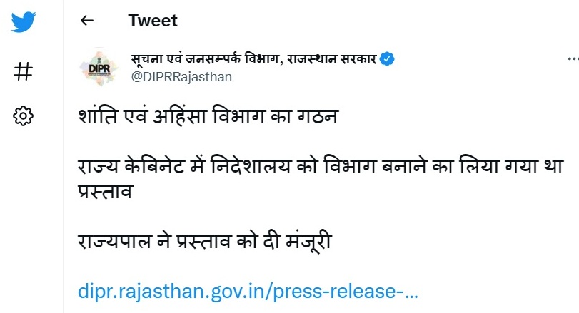 राजस्थान में शांति एवं अहिंसा विभाग के गठन को मिली राज्यपाल से मंजूरी, राज्य केबिनेट में शांति एवं अहिंसा निदेशालय को विभाग बनाने का लिया गया था प्रस्ताव October 3, 2022 No Comments