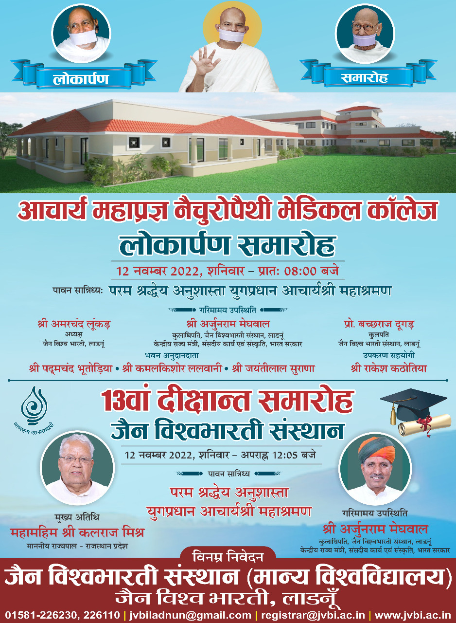 लाडनूं में आज राज्यपाल कलराज मिश्र और केन्द्रीय मंत्री अर्जुन राम मेघवाल रहेंगे। होगा आचार्य महाप्रज्ञ नेचुरोपैथी मेडिकल सेंटर का उद्घाटन और जैन विश्वभारती विश्वविद्यालय का 13वां दीक्षांत समारोह। November 12, 2022 No Comments
