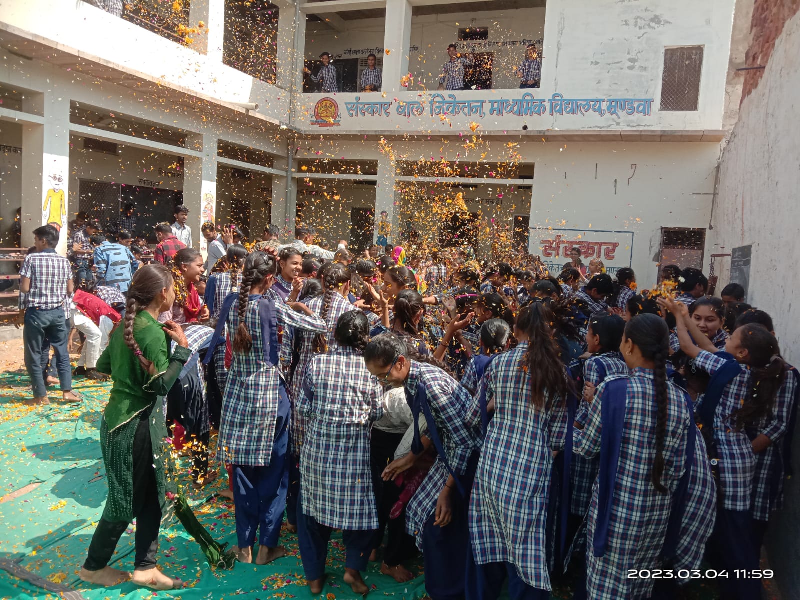 मूण्डवा (रिपोर्टर लाडमोहम्मद खोखर)। स्थानीय संस्कार बाल निकेतन माध्यमिक विद्यालय में शनिवार को होली उत्सव कार्यक्रम आयोजित किया गया। इसमें स्कूली बच्चों ने एक-दूसरे को अबीर-गुलाल लगाकर व फूलों से होली की मस्ती की। कार्यक्रम में सभी बच्चों ने रंगों के पर्व पर सांस्कृतिक कार्यक्रम प्रस्तुत किए। इस मौके पर विद्यालय के निदेशक अब्दुल रहमान देवड़ा ने कहा कि होली आपसी भाईचारे का प्रतीक है। हम सभी लोगो को सांप्रदायिक सौहार्द बनाए रखना एवं आपसी गिले-शिकवे दूरकर इस पर्व को मनाना चाहिए। उन्होंने सभी बच्चो को घर पर सुरक्षित होली खेलने के बारे में बताया।