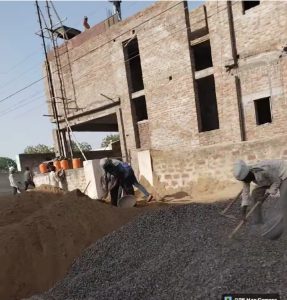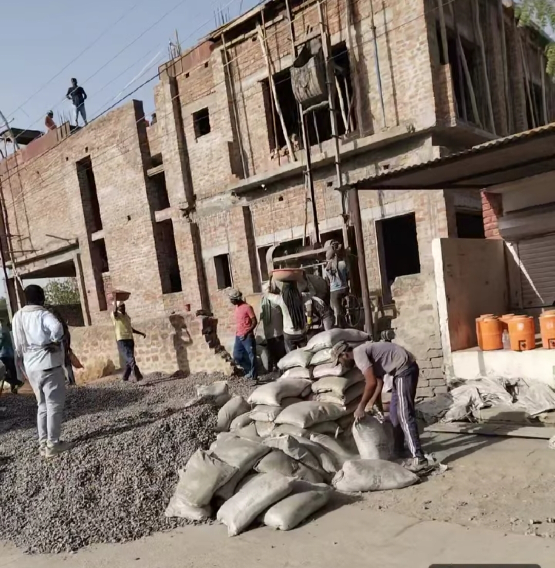 मंगलम के पास बन रही विशाल बिल्डिंग बेधड़क, दनादन चल रहा है काम और मैटेरियल से रोक रखी है पूरी सड़क