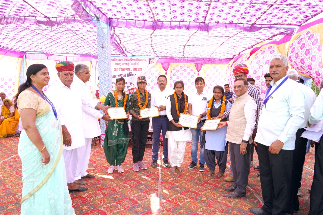 इस अवसर पर विद्यालय परिवार द्वारा भामाशाहों एवं पूर्व विद्यार्थियों को मोमेंटो एवं प्रशस्ति पत्र प्रदान कर सम्मानित किया गया। समारोह में विशिष्ट अतिथियों के रूप में तहसीलदार डॉ. सुरेंद्र भास्कर, थानाधिकारी राजेंद्र सिंह कमांडो, एडीपीसी बस्तीराम सांगवा, पूर्व एसीबीईओ रामनिवास घोटिया, तोषनीवाल ट्रस्ट प्रतिनिधि डॉ. राम गोपाल जाट, डॉ. हेमंत मिश्रा, सीबीईओ रामचंद्र भाटी, आरपी रघुनाथ घोटिया, एसीबीईओ रामनारायण चौधरी पिपराली, खेल गुरू रामनिवास सहू, नंदकिशोर कांकाणी, रामकुमार कांकाणी, हनुमान राम भाकर, मदनलाल धेतरवाल, पुरखाराम गेणा, जवानाराम प्रजापत, प्रधानाचार्य श्रवण कुमार गेणा, रामकरण जाजड़ा, बंशीलाल मेघवाल आदि उपस्थित रहे। कार्यक्रम का संचालन व्याख्याता अशोक कुमार पूनिया ने किया।