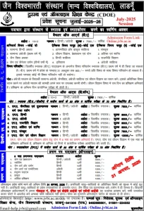 लाडनूं (kalamkala.in)। जैन विश्वभारती संस्थान (मान्य विश्वविद्यालय) के दूरस्थ एवं आॅनलाईन शिक्षा केन्द्र में विभिन्न स्नातक, स्नातकोत्तर एवं प्रमाणपत्र पाठ्यक्रमों में प्रवेश जारी है। इनके माध्यम से कोई भी व्यक्ति कहीं भी कार्यरत रहते हुए अथवा घर बैठे पढाई कर सकता है और डिग्री प्राप्त कर सकता है। इसके लिए प्रवेश लेने की अंतिम तिथि 31 अगस्त निर्धारित की गई है। कुलसचिव राजेश मौजा ने बताया कि स्नातकोत्तर (द्विवर्षीय एम.ए.) के लिए जैन विद्या एवं तुलनात्मक धर्म व दर्शन, हिंदी, अंग्रेजी, राजनीति विज्ञान, अहिंसा एवं शांति, संस्कृत तथा योग एवं जीवन विज्ञान विषयों में करने के विकल्प उपलब्ध हैं। स्नातक (बी.ए.) के लिए ऐच्छिक विषयों में आगम विद्या और प्राकृत साहित्य, जीवन विज्ञान-प्रेक्षाध्यान एवं योग, हिन्दी साहित्य, इतिहास, संस्कृत, अहिंसा एवं शांति, राजनीति विज्ञान, अंग्रेजी साहित्य विषयों के विकल्प उपलब्ध हैं। छह माह के प्रमाण पत्र पाठ्यक्रमों में योग एवं प्रेक्षाध्यान, ज्योतिष, जैन धर्म और दर्शन, जैन आर्ट एवं एस्थेटिक्स, ह्यूमेन राईट्स, प्राकृत तथा अहिंसा प्रशिक्षण विषयों के विकल्प मौजूद हैं।