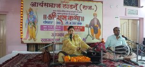लाडनूं (kalamkala.in)। आर्य समाज संस्थान लाडनूं के तत्वावधान में मालियों के बास स्थित सैनी अतिथि भवन में चार दिवसीय श्रीराम कथा का शुभारंभ गुरुवार को किया गया। कथा वाचन कार्यक्रम में आर्या विदुषी सुश्री अंजलि आर्य के सुमधुर वाणी ने कथावाचन किया। अंजलि आर्य ने मर्यादा पुरुषोत्तम श्रीराम के जीवन चरित्र को उकेरते हुए उनके गुणों के बारे में विस्तार से बताया। उन्होंने श्री राम को मर्यादा पुरुषोत्तम व वैदिक संस्कृति का आदर्श बताया और कहा कि उनके अनुसरण से ही भारत का भाग्योदय संभव है। अंजलि आर्य द्वारा प्रस्तुत आध्यात्मिक विचारों और प्रेरणादायक वचनों ने लोगों ने खूब सराहा।