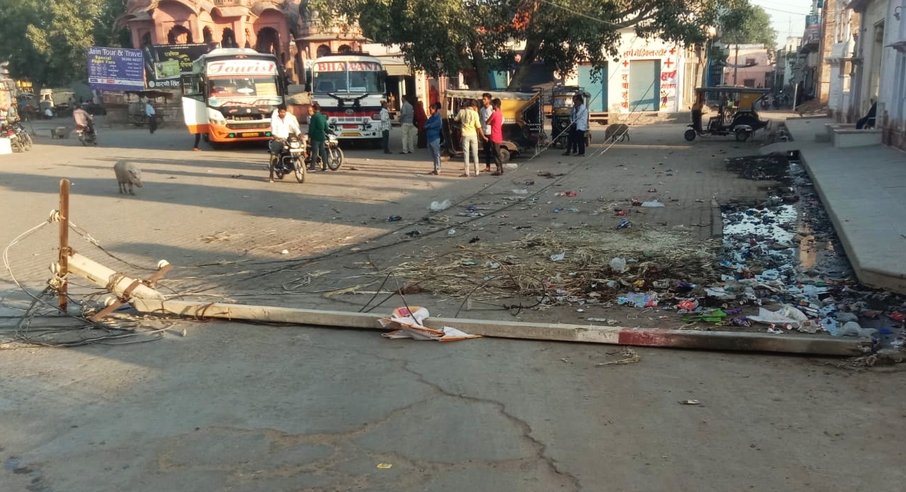 लाडनूं के बस स्टेंड पर जर्जर खंम्भे के अचानक गिरने से अफरा-तफरी मची